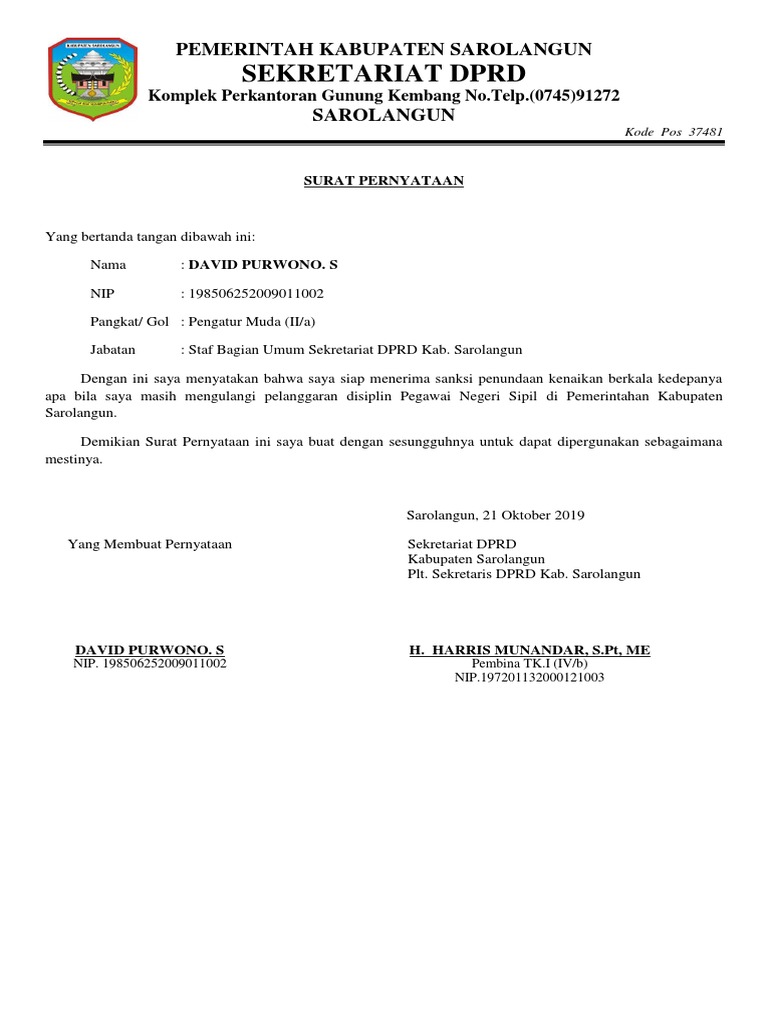 Surat Pernyataan Tidak Mengulangi Pelanggaran Disiplin Pegawai Pdf